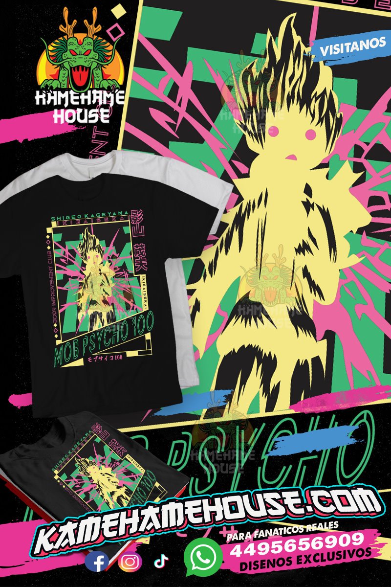 Playeras con diseños de Mob, Reigen, Dimple, Teru, Ritsu y más, capturando la esencia única del arte vibrante y la intensidad del anime.